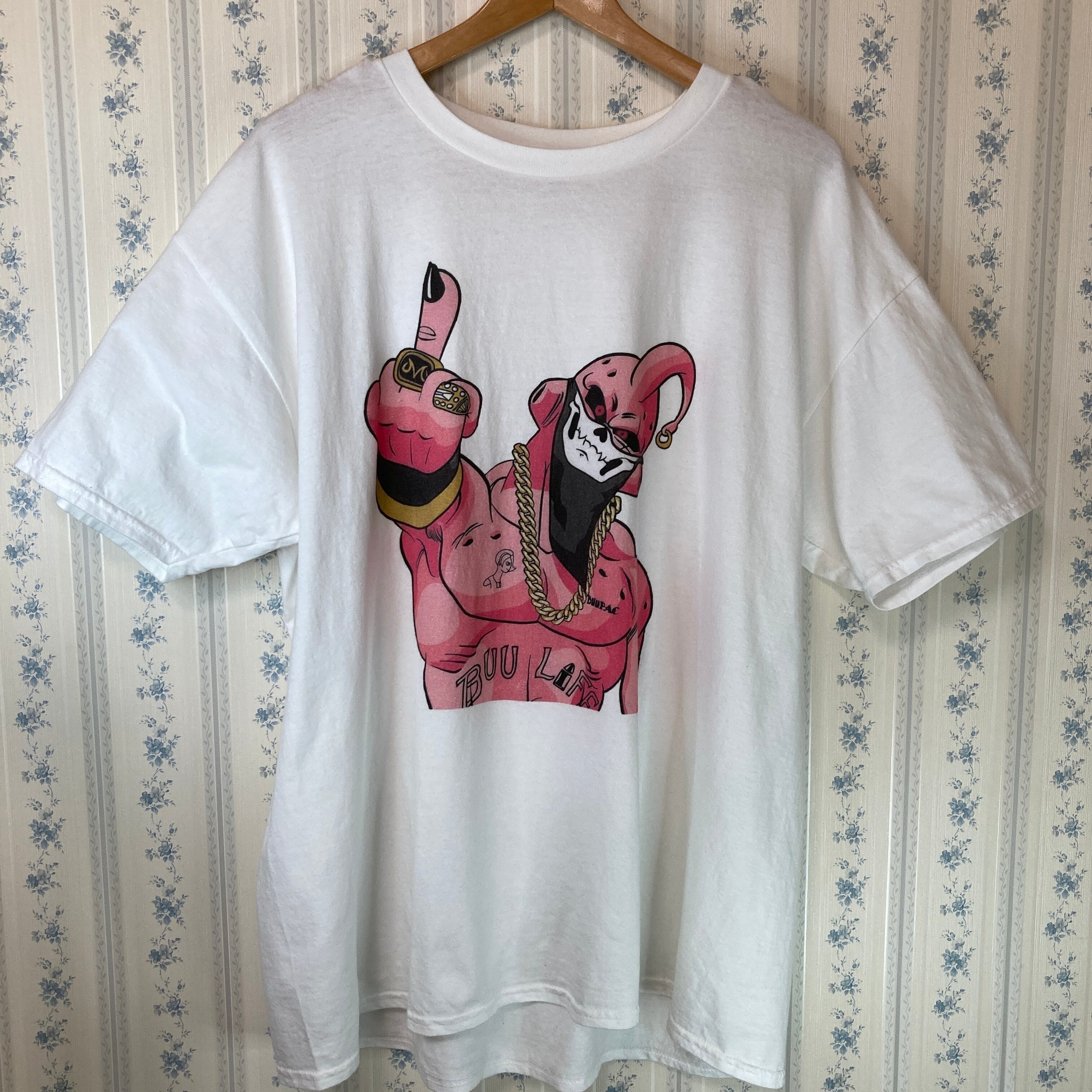 ◆特徴:映える白Tにピンク色で映り込むものはなんと!ドラゴンボールでお馴染み最凶キャラ魔人ブウ!しかも様子がおかしい?バッキバキの肉体にジャラジャラのゴールドアクセ!おまけにタトゥーと来たもんだ!そうなんです!HIPHOPで知らない者は居ない2パックの影響をモロに受けた魔人ブウ自称BOOPACと呼んでいるそうです。タグが切られているので詳細はふめいですが、ハイセンスなTシャツはいかが?